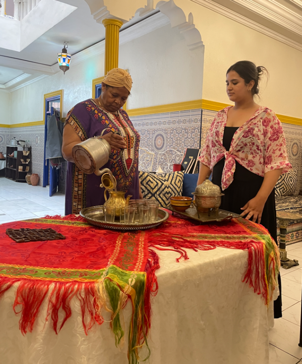 From the moment I arrived in Marrakech, I felt enveloped by color, scent, and sound. These reminders proved that wellness is woven into daily life. My first stop was the riad I was staying at, a family-run guesthouse built around a serene courtyard filled with orange trees, tired foundations, and a relaxing pool to cool off in, directly in the center. I was greeted with mint tea, which, as I learned, is not simply a beverage- it is a wellness ritual. The pouring of tea from a height is both functional and symbolic, allowing the tea to aerate while representing generosity and grace. The owner of the riad came and shared tea with me as they showed me a map of the medina, or the market we were situated in. This made me reflect on how wellness can be both simple and sacred: taking time to connect with others over something warm and healing.